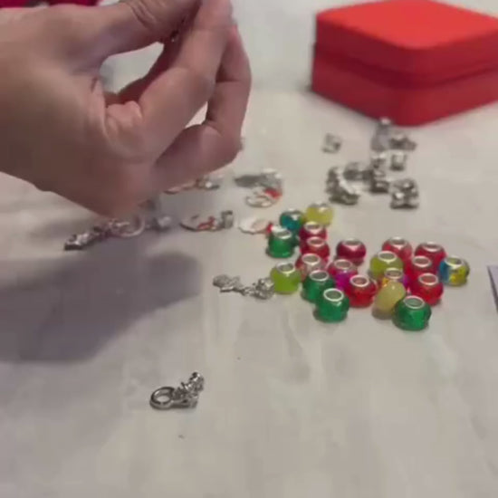 Este hermoso joyero no solo protege tus accesorios, ¡también te invita a armar tu propia pulsera personalizada! Incluye piedritas y adijes con motivos navideños, ideales para diseñar un detalle único lleno de espíritu festivo.